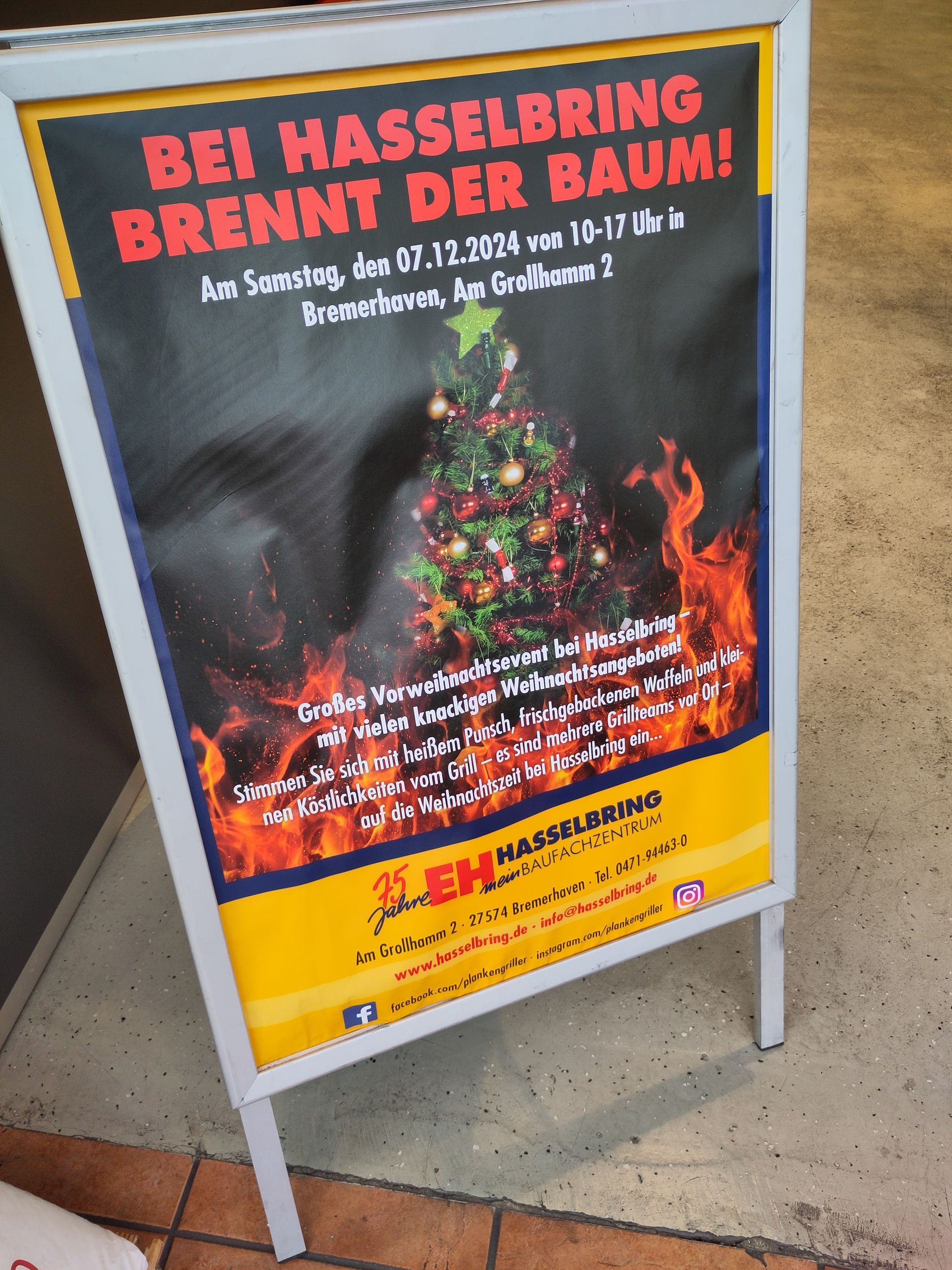 Wir sind schon fleissig und bereiten das diesjährige "Bei Hasselbring brennt der Baum" mit vor. Die Grillteams von unseren Hauptlieferanten Napoleon, Traeger, Monolith und Petromax stehen in den Startlöchern und haben leckere Rezepte ausgearbeitet. Pommes aus dem DutchOven und Bratwurst vom Napoleon Freestlye 425 sind ebenfalls erhältlich. Mit dabei in diesem Jahr natürlich wieder die leckeren Waffeln und der heiße Kaffee / Punsch. Ein Zauberer zieht die Kinder in seinen Bann oder sie sich versuchen sich bei der Glückssteinsuche. Der Baum brennt am 07.12.2024 von 10:00 bis eta 17:00 Uhr. Wir freuen uns auf ein tolles Event! Der Parkplatz vom Nordsee-Druckzentrum kann mit genutzt werden - die Schranke bleibt oben!